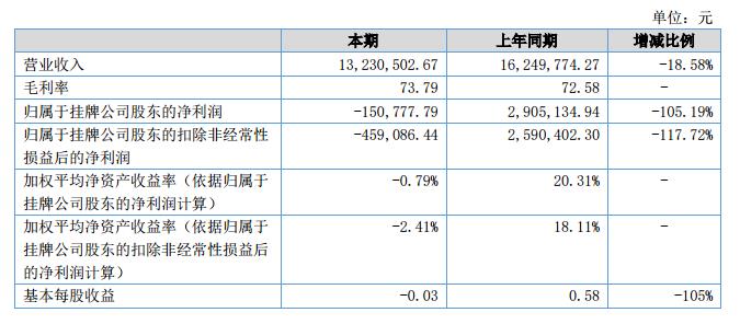 報(bào)告期內(nèi),公司營(yíng)業(yè)收入13,230,502.67元,同比下降18.58%;營(yíng)業(yè)成本3,467,324.21元,同比下降22.18%;凈利潤(rùn)-150,777.79元,同比減少-105.19%。