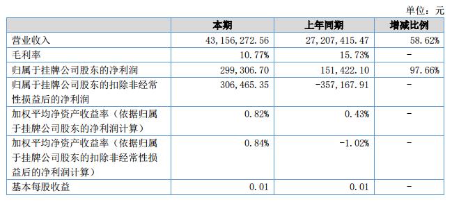本期營業(yè)收入與上期相比增加15,948,857.09元,增加58.62%;本期公司毛利率為10.77%,較上年同期毛利率15.73%有所下降;本期凈利潤與上期相比增加147,884.60元,增加97.66%,。