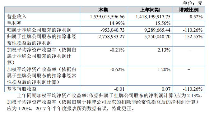 報(bào)告期內(nèi)公司實(shí)現(xiàn)營(yíng)業(yè)收入153901.56萬(wàn)元,比去年同期增長(zhǎng)8.52%;實(shí)現(xiàn)歸屬于母公司股東的凈利潤(rùn)-95.30萬(wàn)元,比去年同期下降110.26%。?