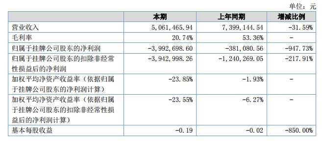 報(bào)告期內(nèi),公司實(shí)現(xiàn)營業(yè)收入506.15萬元,較上年同期減少31.59%;營業(yè)成本401.18萬元,較上年同期增加16.26%;毛利率為20.74%,同比降低32.62個(gè)百分點(diǎn);歸屬于掛牌公司股東的凈利潤-399.27萬元,同比降低947.73%。