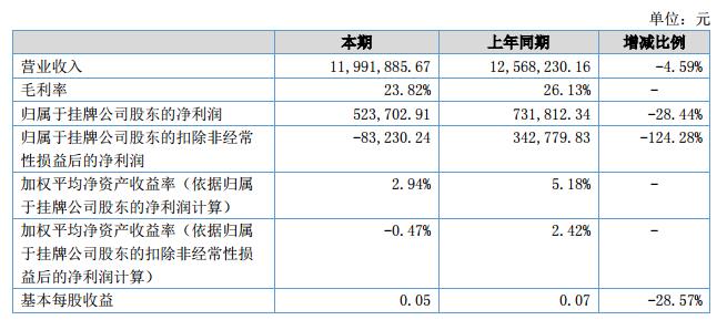 公司在報(bào)告期內(nèi)的主營(yíng)業(yè)務(wù)收入為11,991,885.67元,比上年度減少576,344.49元;營(yíng)業(yè)成本為9,135,766.99元,比上年度減少148,480.95元;歸屬于母公司的凈利潤(rùn)為523,702.91元,比上年度減少208,109.43元。?