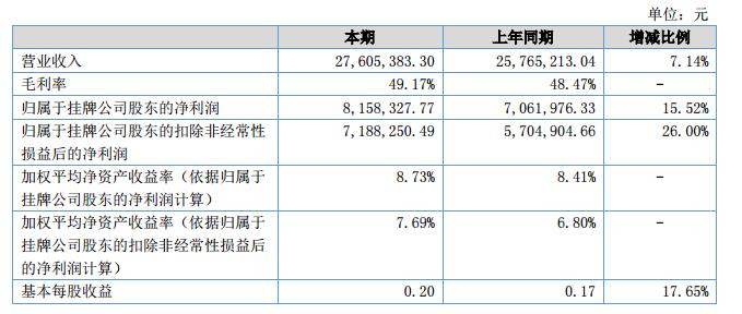 報(bào)告期內(nèi)公司實(shí)現(xiàn)營(yíng)業(yè)總收入27,605,383.30元,比上年同期增加7.14%;凈利潤(rùn)8,158,327.77元,比上年同期增加15.52%。?
