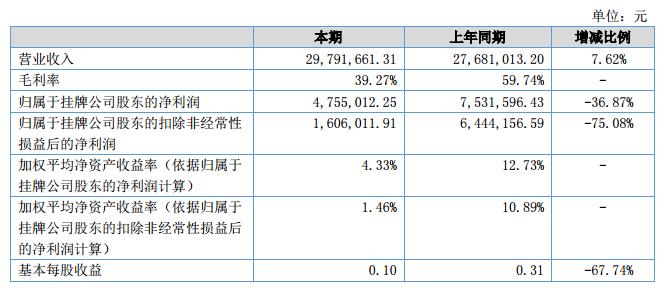 報(bào)告期內(nèi),公司實(shí)現(xiàn)營業(yè)收入29,791,661.31元,,較上年同期增加2,110,648.11元,增幅7.62%;凈利潤為4,755,012.25元,較上年同期減少2,776,584.18元,降幅36.87%。?