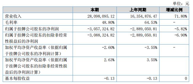 報告期內(nèi),公司營業(yè)總收入28,098,095.12元,較上年同期增加71.80%;營業(yè)利潤-2,707,089.27元,較上年同期減少5.63%;利潤總額-2,707,089.27元,較上年同期減少5.63%;歸屬于掛牌公司股東的凈利潤-3,057,324.82元,較上年同期減少5.82%。?