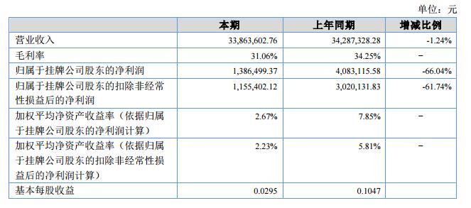報(bào)告期內(nèi)公司實(shí)現(xiàn)營業(yè)收入3386.36萬元,較上年同期下降1.24%;營業(yè)成本為2334.62萬元,較上年同期增加3.56%;實(shí)現(xiàn)利潤總額108.43萬元,較上年同期下降75.90%;實(shí)現(xiàn)凈利潤106.44萬元,較上年同期下降72.00%,歸屬于掛牌公司股東的凈利潤為138.65萬元,較上年同期下降66.04%。?