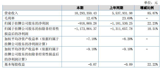本期公司營業(yè)收入10,268,162.40元,上年同期營業(yè)收入5,537,931.98元,收入增長85.87%;實現(xiàn)凈利潤-918,869.28元,上年同期-1,181,530.25元。凈利潤同比增長22.23%。