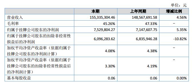 本期實(shí)現(xiàn)營(yíng)業(yè)收入155,335,304.46元,比去年同期的148,567,691.58元,增長(zhǎng)4.56%;實(shí)現(xiàn)營(yíng)業(yè)成本85,032,596.88元,比上年同期78,253,978.88元,提高8.66%;實(shí)現(xiàn)歸屬于母公司所有者的凈利潤(rùn)7,529,804.27元,比上年同期7,147,607.75元,增長(zhǎng)5.35%。?