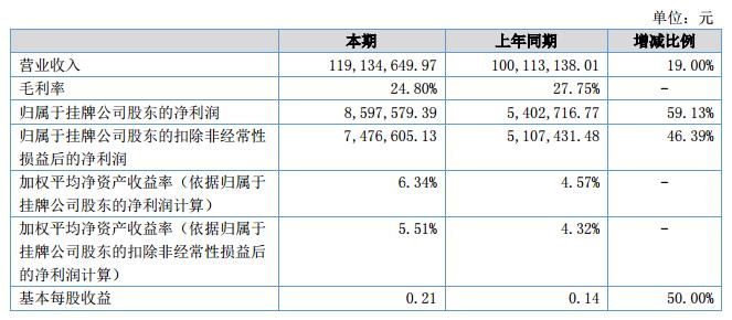 報告期內(nèi),公司實現(xiàn)銷售額11,913.46萬元,較上年同期增長19.00%;完成研發(fā)投入852.38萬元,占營業(yè)收入比例7.15%,較上年同期增長-2.73%;實現(xiàn)總資產(chǎn)28,706.58萬元,較2017年末增長7.28%;實現(xiàn)凈利潤842.60萬元,較上年同期增長58.07%。?