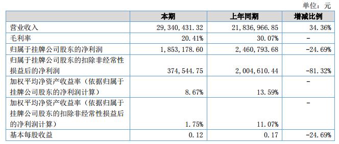 報(bào)告期內(nèi)公司營(yíng)業(yè)收入為29,340,431.32元,去年同期為21,836,966.85元,本期較去年同期增長(zhǎng)了34.36%?;歸屬于公司股東凈利潤(rùn)1,853,178.60元,較去年同期2,460,793.68元減少24.69%。?