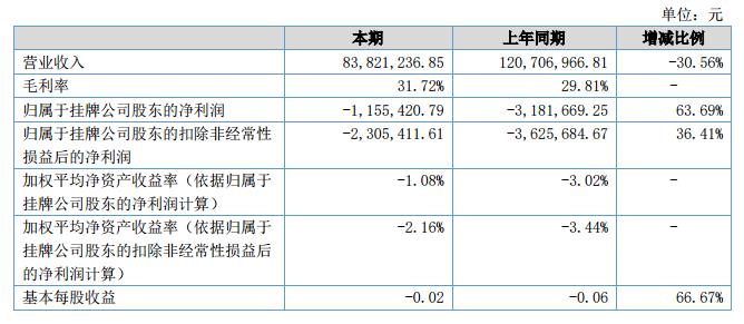 報告期末,公司實(shí)現(xiàn)營業(yè)收入83,821,236.85元,較上年同期減少30.56%;凈利潤虧損1,155,420.79元,較上年同期增加63.69%,凈利潤虧損較上年同期減少的原因為公司期間費(fèi)用的減少。?