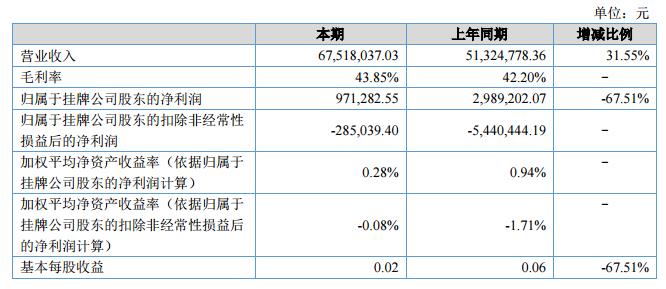 報(bào)告期內(nèi),公司實(shí)現(xiàn)營(yíng)業(yè)收入6,751.80萬元,較上年同期增長(zhǎng)31.55%。歸屬于母公司股東的凈利潤(rùn)97.13萬元,較上年同期減少201.79萬元。?