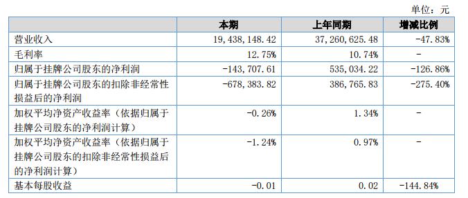 報(bào)告期內(nèi),公司實(shí)現(xiàn)營(yíng)業(yè)收入1,943.81萬(wàn)元,同比下降47.83%,實(shí)現(xiàn)凈利潤(rùn)-14.37萬(wàn)元,同比下降127.27%。?