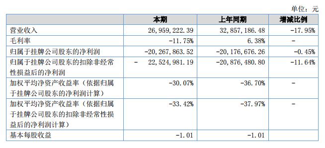 報告期內(nèi)公司實現(xiàn)營業(yè)收入2,695.92萬元,同比下降17.95%;營業(yè)總成本4579.67萬元,同比下降8.76%;營業(yè)利潤-1983.82萬元,同比下降22.05%;凈利潤-2054.59萬元,同比下降1.71%。?