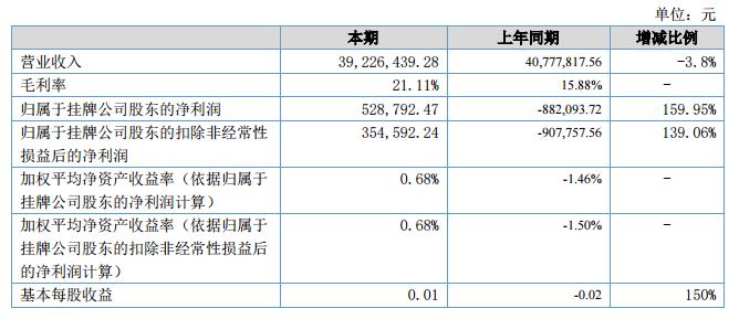 報告期內(nèi),公司實現(xiàn)營業(yè)收入39,226,439.28元,較上年同期減少1,551,378.28元,實現(xiàn)歸屬于母公司股東凈利潤528,792.47元,比去年同期增加1,410,886.19元。?