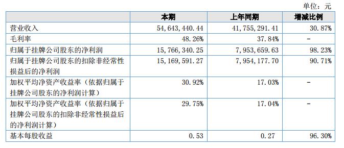 報(bào)告期內(nèi)公司實(shí)現(xiàn)營(yíng)業(yè)收入約5464.34萬(wàn)元,同比增長(zhǎng)30.87%,歸屬于掛牌公司股東的凈利潤(rùn)約1576.63萬(wàn)元,同比增長(zhǎng)98.23%。?