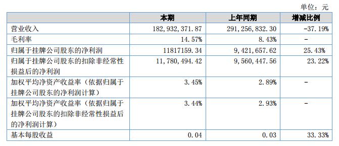 報(bào)告期內(nèi),公司營(yíng)業(yè)收入為18,293.24萬元,同比減少37.19%,營(yíng)業(yè)成本為15,628.08萬元,同比減少41.40%;公司實(shí)現(xiàn)凈利潤(rùn)1,181.72萬元,較上年同期增長(zhǎng)25.43%。?