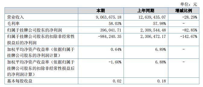報告期內,公司實現營業(yè)收入:906.37萬元,同比減少了28.29%;公司營業(yè)成本380.39萬元,同比減少了28.39%;公司的凈利潤39.60萬元,同比下降了82.85%。?