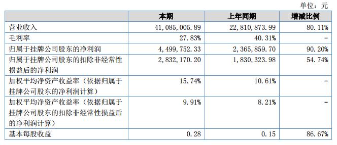 報告期內公司營業(yè)收入增長80.11%,增加凈額1,827.41萬元;歸屬于母公司凈資產為2,784.03萬元,較期初增長5.69%,增加凈額149.98萬元。