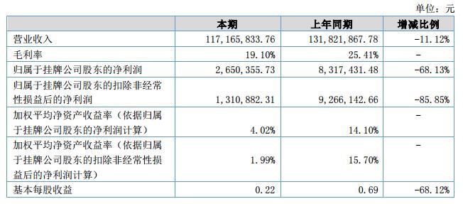 報(bào)告期內(nèi),公司實(shí)現(xiàn)營(yíng)業(yè)收入117,165,833.76元,較上年同期下降11.12%;實(shí)現(xiàn)凈利潤(rùn)2,650,355.73元,較上年同期下降68.13%。?