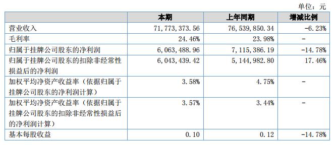 報告期內,公司實現(xiàn)營業(yè)收入7,177萬元,較上年同期降低6.23%;報告期內,公司實現(xiàn)營業(yè)利潤655.91元,同比減少180.85萬元。?