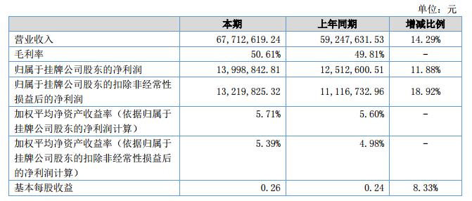 報(bào)告期內(nèi)公司實(shí)現(xiàn)收入67,712,619.24元,較上年同期增加8,464,987.71元;營業(yè)成本33,446,560.07元,較上年同期增加3,707,524.12元;實(shí)現(xiàn)凈利潤13,998,842.81元,較上年同期增加1,486,242.30元。