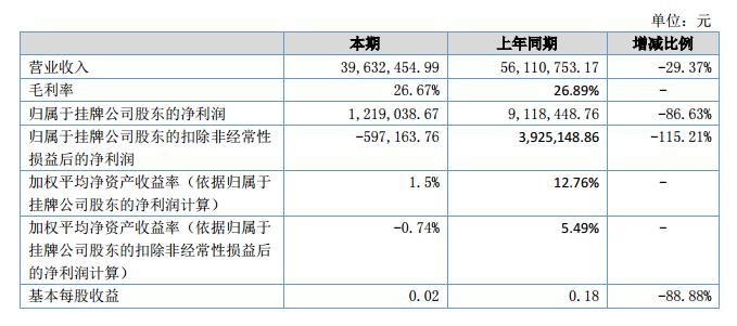 報(bào)告期內(nèi)公司實(shí)現(xiàn)營(yíng)業(yè)收入3,963.24萬元,比去年同期減少了1,647.83萬元,同比下降29.37%;凈利潤(rùn)1,219,038.67萬元,較去年同期減少了789.94元,同比下降86.63%。