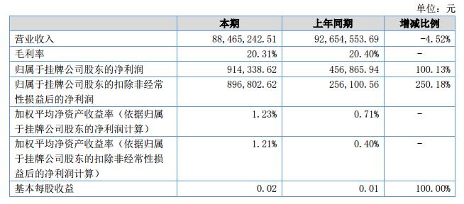 報告期內(nèi),公司共實現(xiàn)營業(yè)收入88,465,242.51元,比上年度減少4.52%;歸屬于掛牌公司股東的凈利潤914,338.62元,比上年同期增加100.13%。