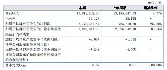 報(bào)告期內(nèi),公司實(shí)現(xiàn)營(yíng)業(yè)收入1,382萬元,比上年同期的1,319萬元增長(zhǎng)了63萬元,增長(zhǎng)率為4.77%;銷售毛利率為13.12%,較上年同期減少十二個(gè)百分點(diǎn);實(shí)現(xiàn)歸屬于掛牌公司股東的凈利潤(rùn)為-377.83萬元,比上年同期減少393.38%。?