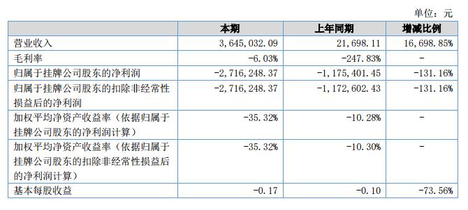 報告期內(nèi),營業(yè)收入3,645,032.09元,同比上升16698.85%;凈利潤-2,716,248.37元,同比下降131.16%。?