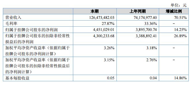 報告期內公司實現營業(yè)收入12,647.35萬元,較去年同期的7,417.50萬元增加了70.51%;?公司實現凈利潤4,451,029.01元,同比增長14.25%。