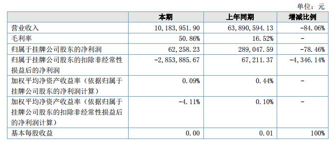 公司經(jīng)營成果:截止報告期末,公司營業(yè)收入為10,183,951.90元,較去年同期減少84.06%;歸屬于母公司所有者的凈利潤為62,258.23元,較上年期末減少78.46%。?