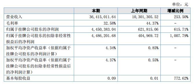 報告期內(nèi),公司實現(xiàn)營業(yè)收入36,415,011.64元,比上年同期增加26,113,706.12元,增長率為253.50%;公司實現(xiàn)營業(yè)利潤5,040,045.10元,比上年同期增加4,352,251.63元,增長比率為632.78%,實現(xiàn)凈利潤4,450,383.04元,比上年同期增加3,828,567.98元,增長比率為615.71%。