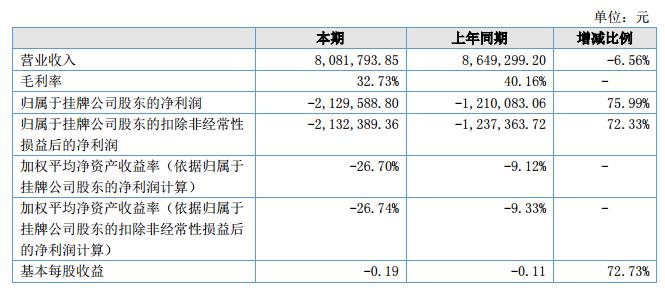 2018年上半年,公司實現(xiàn)營業(yè)總收入8,081,793.85元,同比下降6.56%;毛利率32.73%,同比下降了7.43%;歸屬于掛牌公司股東的凈利潤為-2,129,588.80元,同比下降75.99%?