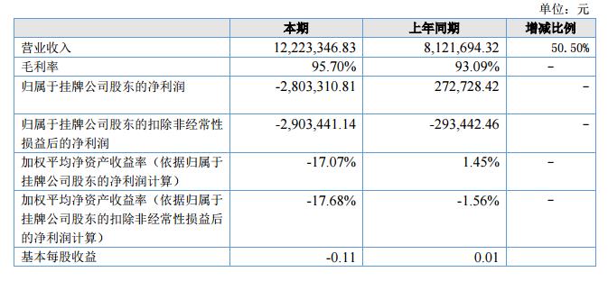 報告期內(nèi)公司實現(xiàn)營業(yè)收入12,223,346.83元,比上年同期增加4,101,652.51元,同比增長50.50%;凈利潤-2,803,310.81元?。