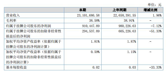 報(bào)告期內(nèi)公司實(shí)現(xiàn)營(yíng)業(yè)收入23,101,686.58元,比上年同期增加44.33萬(wàn)元,同比增加1.96%;凈利潤(rùn)910,447.89元,比上年同期減少6.98萬(wàn)元,同比下降7.12%?。