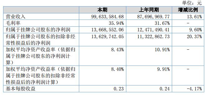 報(bào)告期內(nèi),公司實(shí)現(xiàn)營業(yè)收入9,963.36萬元,同比增長13.61%;公司實(shí)現(xiàn)凈利潤1,316.87萬元,同比增長6.90%。?