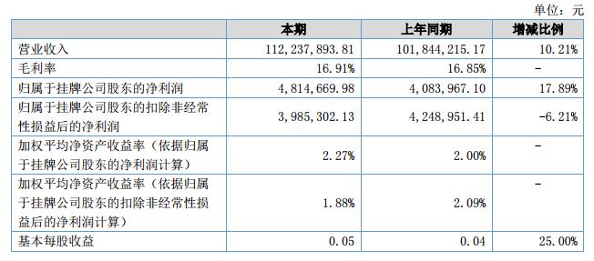 報告期內,實現(xiàn)營業(yè)收入112,237,893.81元,凈利潤4,814,746.05元,較上年同期營業(yè)收入增長10.21%,凈利潤增長17.89%。?