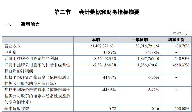 報告期內(nèi),公司經(jīng)營狀況較差,營業(yè)收入為2140.78萬元,較去年同期下降30.76%;營業(yè)成本為2964.88 萬元,與去年持平;凈利潤為-852.00萬元,較去年同期下降548.95%;毛利率為31.89%,較去年同期大幅下降。
