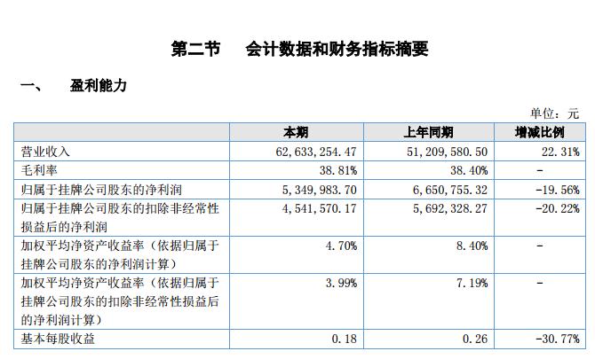 報告期內(nèi),公司實現(xiàn)營業(yè)收入 62,633,254.47 元,較去年同期增加了 11,423,673.97 元,增長率為 22.31%,主要隨著公司業(yè)務(wù)實力和品牌知名度的提升,公司業(yè)務(wù)規(guī)模得以提升,營業(yè)收入得到提高,其中主要是地理信息數(shù)據(jù)庫業(yè)務(wù)的規(guī)模擴張。報告期內(nèi)公司營業(yè)成本為 38,325,290.12 元,較去年同期增加 6,779,624.32 元,增長率為 21.49%,主要系公司規(guī)模擴大,業(yè)務(wù)量增加,營業(yè)成本相應(yīng)提高所致。歸屬于掛牌公司股東的凈利潤 5,349,983.70 元,較去年同期下降 1,300,771.62 元,降低 19.56%,主要是本期公司按照《企業(yè)會計準(zhǔn)則 11 號——股份支付》的規(guī)定進行會計處理,確認(rèn)股份支付的金額為 4.5 元/股,合計 540 萬元,股份支付的部分計入損益及資本公積。