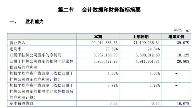 上半年,公司總資產(chǎn)為28,225.89萬元,比上期期末增加 14.38%。應(yīng)收票據(jù)及應(yīng)收賬款為7,923.88 萬元,比上期期末增加 5.96%,主要系報(bào)告期內(nèi)公司營業(yè)收入 9,901.47 萬元,較去年同期增加 39.07%;公司總負(fù)債為為 12,946.67 萬元,較上期期末增加 28.65%.短期借款為 4,100 萬元,比上期期末增長(zhǎng) 78.47%,主要系公司擴(kuò)大生產(chǎn)規(guī)模,設(shè)備投入需求增加。歸屬于掛牌公司股東的凈利潤 695.72 萬元較上年增長(zhǎng) 18.12%。經(jīng)營活動(dòng)凈現(xiàn)金流量為 751.26 萬元,與上年同期相比減少 1,037.07 萬元。