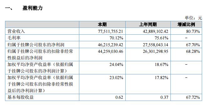 上半年,公司總資產(chǎn) 235,241,991.31 元,較上年同期增長 24.26%;歸屬于掛牌公司股東的凈資產(chǎn) 170,559,182.07 元,較上年同期增長 0.96%;報告期內(nèi),共實現(xiàn)營業(yè)收入 77,511,755.21 元,較上年同期增長 80.73%,歸屬于掛牌公司股東的凈利潤 46,215,239.42 元,較上年同期增長 67.70%;經(jīng)營活動產(chǎn)生的現(xiàn)金流量凈額為 43,231,765.87 元,較上年同期增長 100.20%。2018 年上半年,公司營收、利潤和資產(chǎn)規(guī)模均實現(xiàn)大幅增長,取得了良好的經(jīng)營業(yè)績,這主要得益于 2017 年度公司在全國范圍內(nèi)加大業(yè)務布局力度,銷售人員和項目操作人員數(shù)量均大幅增長,客戶數(shù)量進一步增加,在手訂單量充足,公司品牌影響力和市場口碑進一步提升,這為 2018 年上半年公司的業(yè)績爆發(fā)打下了良好基礎(chǔ)。