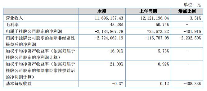 報(bào)告期內(nèi),公司實(shí)現(xiàn)營業(yè)收入11,696,157.43元,比去年同期減少-3.51%;公司凈利潤-2,184,867.78元,比去年同期減少401.91%%。?