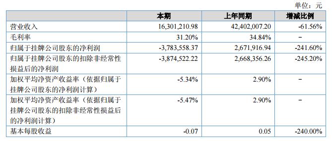 報(bào)告期內(nèi),公司實(shí)現(xiàn)主營業(yè)務(wù)收入為16,301,210.98元,較上年同期減少61.56%;歸屬于掛牌公司股東的凈利潤為-3,783,558.37元,較上年同期減少241.60%。?