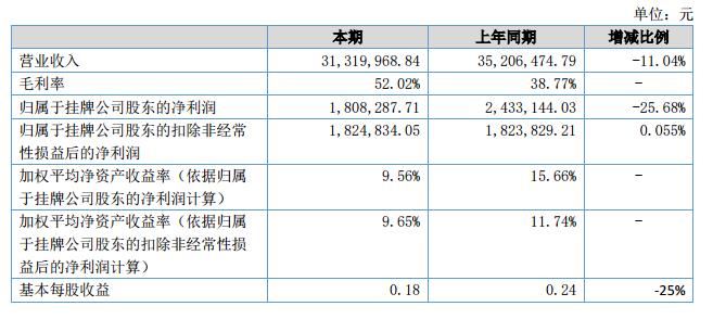 2018年上半年公司實現(xiàn)營業(yè)收入3132萬元,同比減少11%;凈利潤為172萬元,同比減少27.56%。2018年上半年公司的總資產(chǎn)為8264.97萬元,增長了9.08%。凈資產(chǎn)為1981.05萬元,增長了10%左右。?