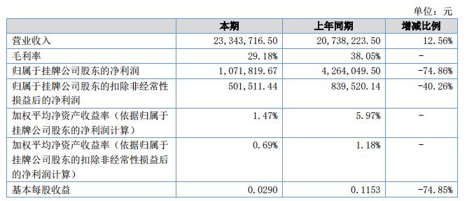 報(bào)告期內(nèi),公司實(shí)現(xiàn)營業(yè)收入2,334.37萬元,較上年同期2,073.82萬元增加12.56%;公司實(shí)現(xiàn)凈利潤107.18萬元,較上年同期426.40萬元下降74.86%。?