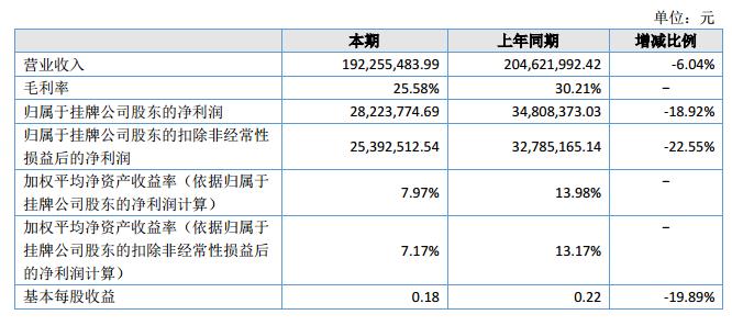報告期內(nèi)營業(yè)收入192,255,483.99元,同比減少6.04%;利潤總額和凈利潤分別為32,467,862.89元、28,223,774.69元,同比減少19.2%、18.92%,?