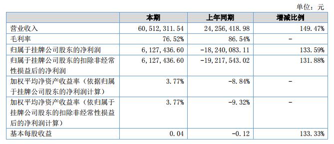 報(bào)告期內(nèi),公司營業(yè)收入為60,512,311.54元,相對(duì)于去年同期上升149.47%;營業(yè)成本為14,210,615.87元,較上年度上升335.28%;凈利潤為6,127,436.60元,較上年度上升133.59%。?