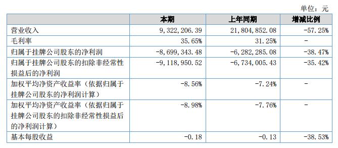 報(bào)告期內(nèi),公司實(shí)現(xiàn)營業(yè)收入9,322,206.39元,較上年同期減少57.25%;營業(yè)成本為5,998,758.81元,比上年同期減少59.99%;歸屬于母公司的凈利潤為-8,699,343.48,較上年同期減少38.47%。?