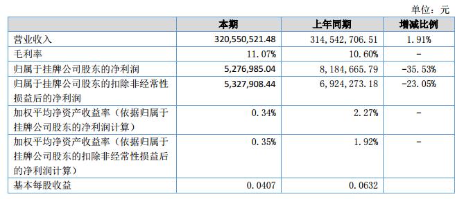 報(bào)告期內(nèi),公司實(shí)現(xiàn)營(yíng)業(yè)收入32,055.05萬元,較上年同期增加了600.78萬元,增加比例1.91%;營(yíng)業(yè)成本較去年同期增加386.55萬元,增加比例1.37%?;實(shí)現(xiàn)凈利潤(rùn)527.70萬元,較上年同期減少296.55萬元,同比下降35.98%。?