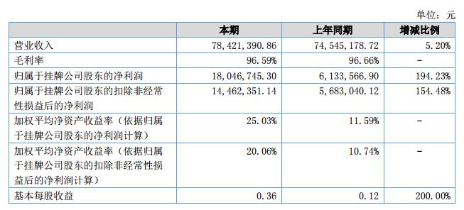 報(bào)告期內(nèi)公司實(shí)現(xiàn)營業(yè)收入7842.14萬元,同比增長5.20%;實(shí)現(xiàn)歸屬于掛牌公司股東的凈利潤1804.67萬元,同比增長194.23%。